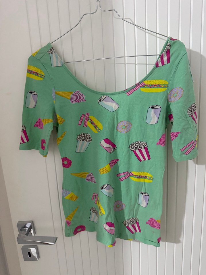 Rahat kesim, tekne yaka, kısa kollu yeşil hamile bluzu. Renkli pop kültür baskılı, düğmeli ve yumuşak kumaştan, günlük partiler için uygun.