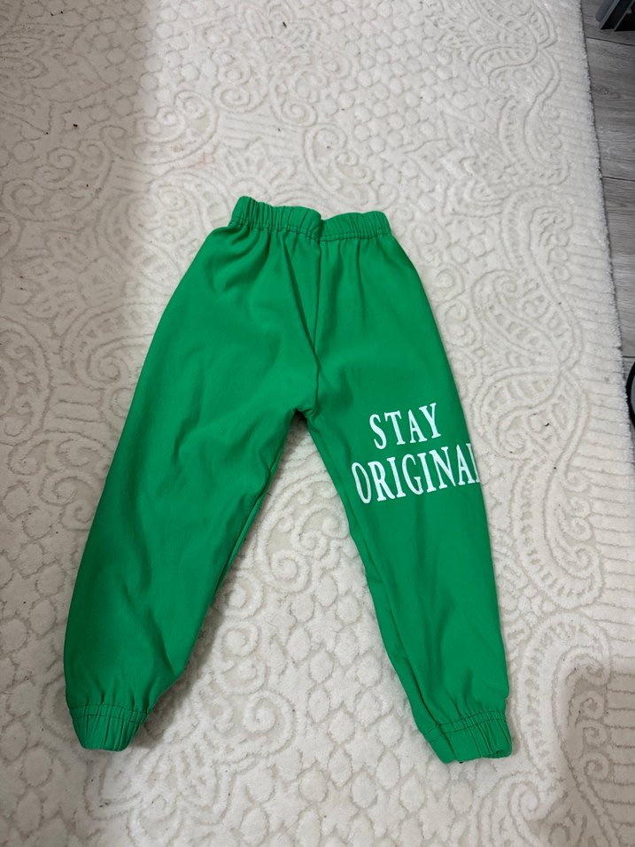 Rahat kesim, elastik bel ve paçalı yeşil kız eşofman altı. Renkli baskılı ve 'STAY ORIGINAL' yazılı desen içerir. Yeni ürün sıfır kullanılmamış fakat poşete getirirken bir su lekesi değmiş ben yıkamadım ufak bir su lekesi çıkaabilir %100 çıkar bilginiz olsun