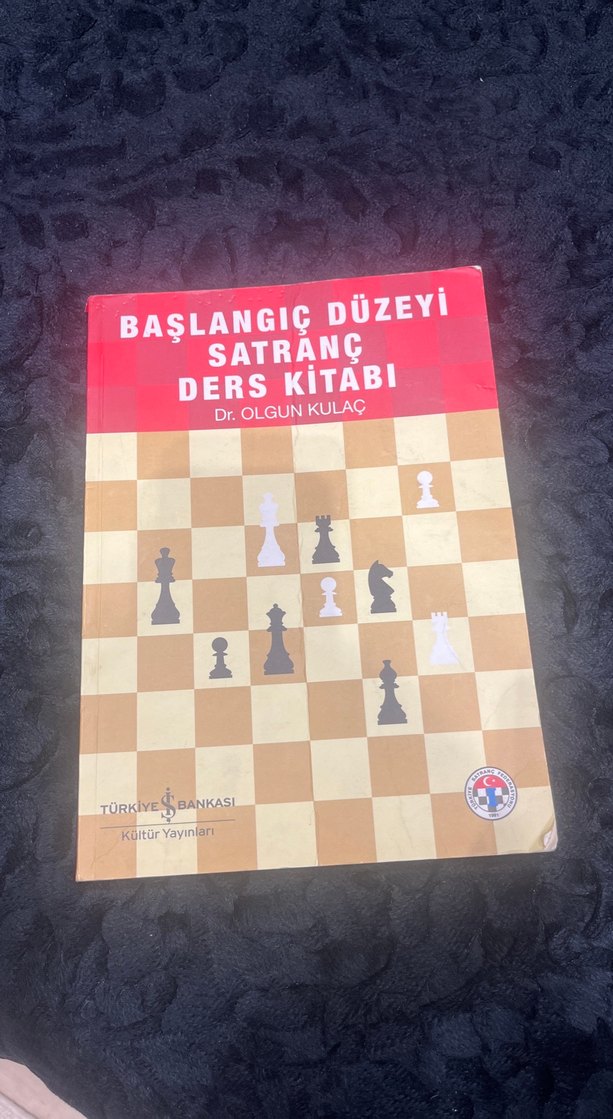 Dr. Olgun Kulaç tarafından hazırlanan başlangıç düzeyi satranç ders kitabı, bordo ve bej renkli satranç tahtası kapağına sahiptir.