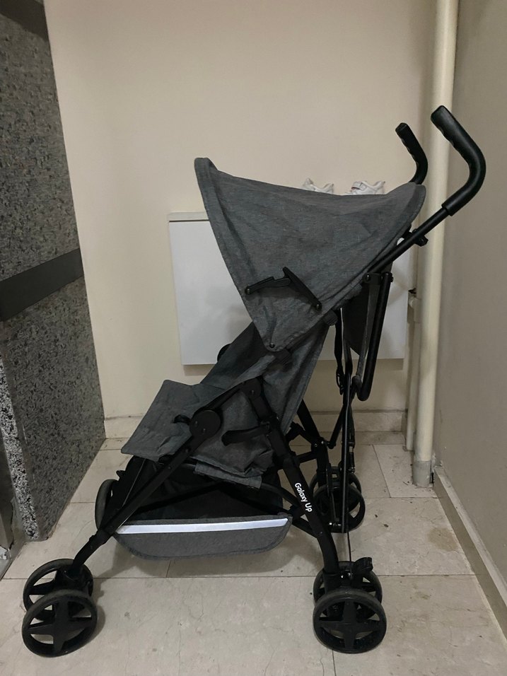 Gri renkli, tente ve alt kısmında saklama sepeti bulunan bebek arabası. Hafif yapılı ve kolay hareket ettirilebilir dört tekerleklidir. 10 gün oldu alalı kızım hiç sevmedi yepyeni sıfır