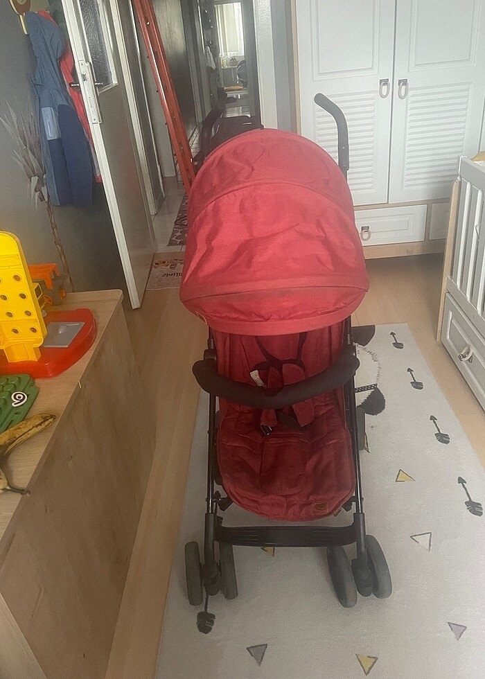 Joker mağazasından alındı tripper model ayarlanabilen sırt mekanizması düz şekilde olup çocuk yatabiliyor ayarlanabilen ayak mekanizması tamamen kapanıp yan tarafında taşıma kulpu var birkaç yerinde lekeler var sepet bölümündeki bezdede hafif yırtılma isteyene videoda göndere bilirim 22 kg taşıma kapasitesi
