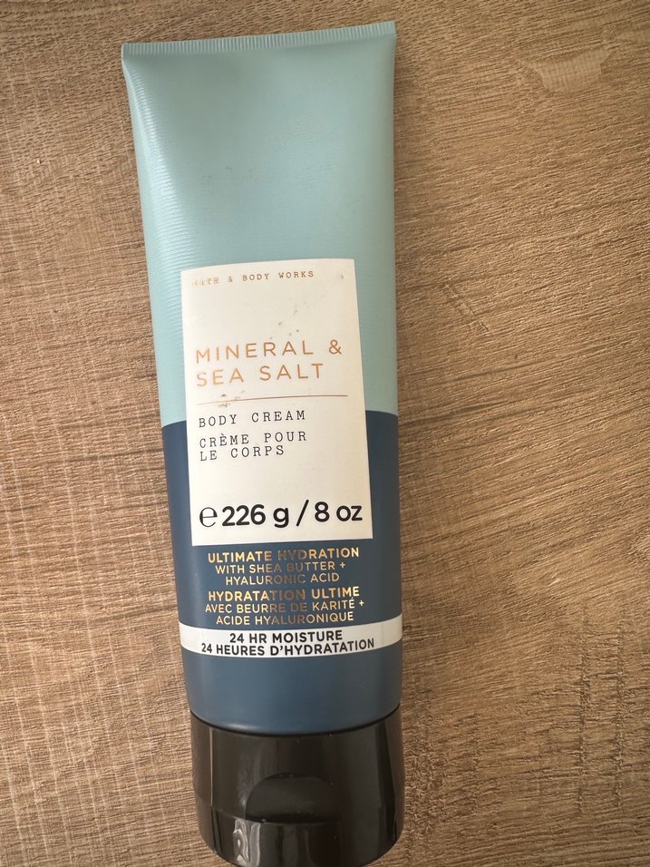 Mineral & Deniz Tuzu vücut kremi, shea yağı ve hyaluronik asit ile 24 saat nem sağlar. 226g (8oz) boyutundadır. Sadece kokusuna bakmak için açıldı