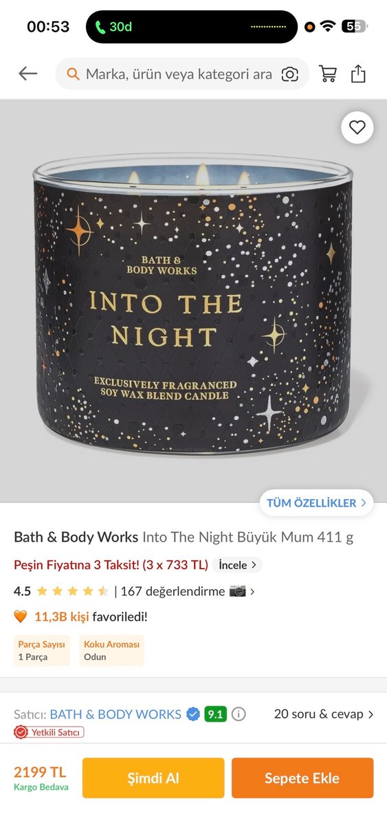 Bath And Body Works İnto the Night kokulu mum sadece 2 kere yakıldı yüzde 95 i duruyor alalı 1 hafta oldu en popüler kokulardan biri Bath & Body Works Into The Night, odun kokulu büyük bir mumdur. Soya mumu karışımından yapılmış olup sıcak ve aromatik bir deneyim sunar. ️