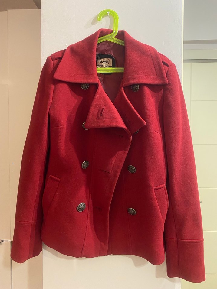 2 Kez kullanıldı, dar geldiği için satıyorum.Kırmızı kaban, çift düğmeli, geniş yaka ve yan ceplidir. Sıcak ve şık bir görünüm sunar.