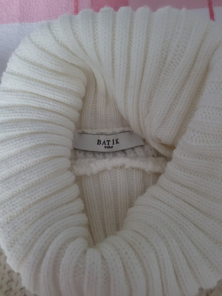 Batik markalı bu beyaz triko kazak, balıkçı yaka ve uzun kollu olup, rahat ve bohem tarzda günlük kullanım için uygundur.