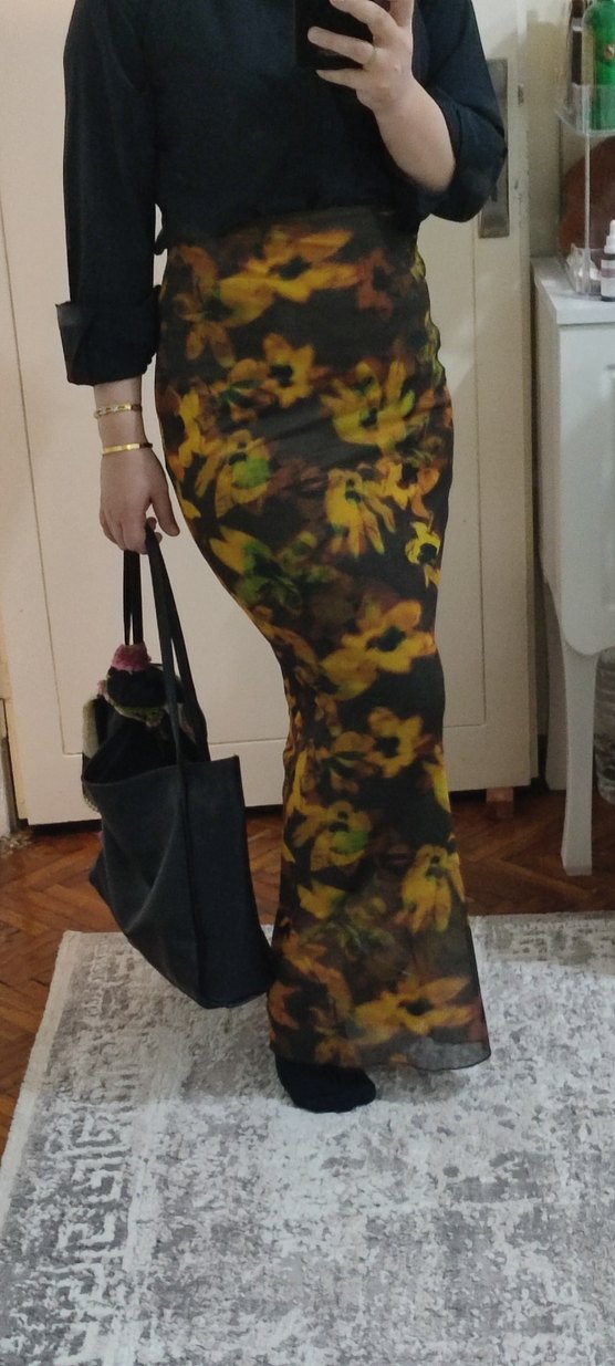 Sarı tonlarında batık desen, uzun ve yüksek bel şifon etek. astarı diz boyunda. tesettür uygun değil. düz kesim bohem sokak stili için uygun.