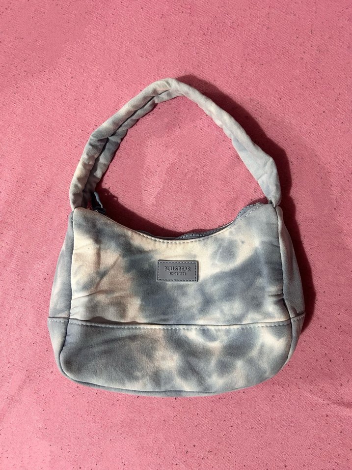 Pastel mavi batik desenli denim çanta, tokalı detaylı, gündelik ve sokak tarzı için uygun.
