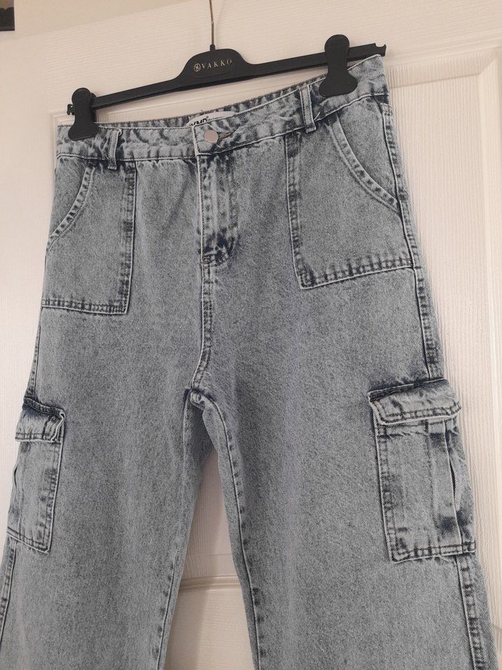 batik desenli kadın denim pantolon, bol kesim ve kemer detaylıdır. Günlük kullanıma uygun sokak tarzını yansıtır.