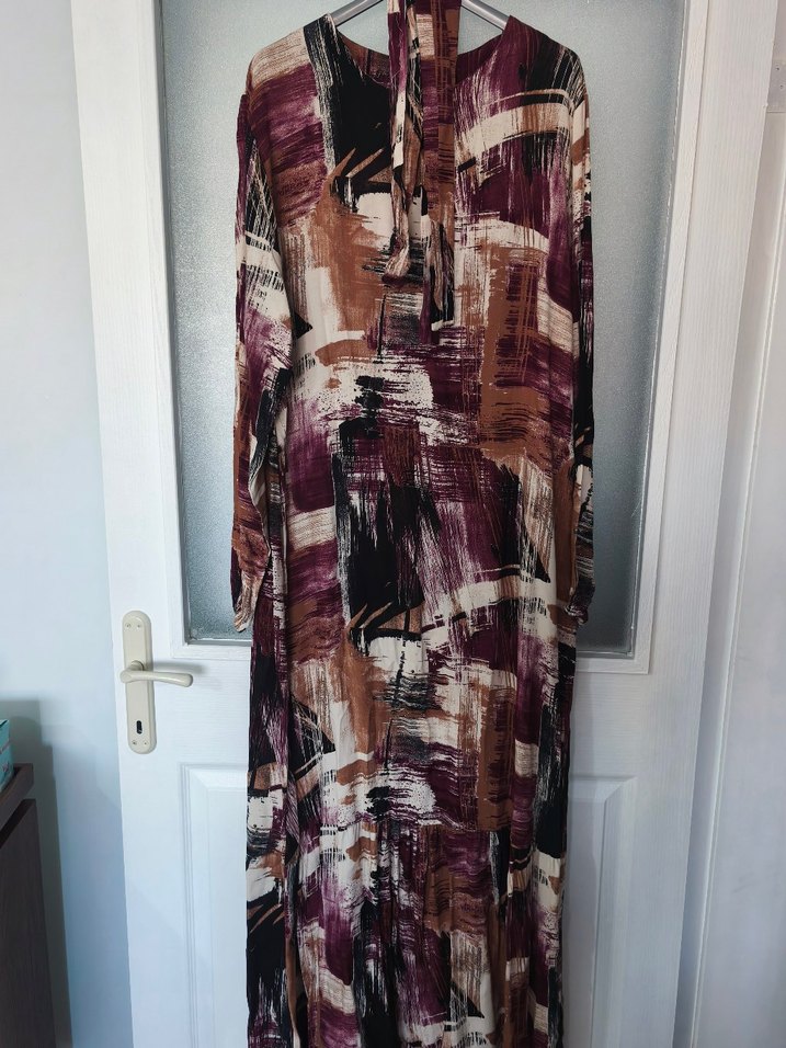 Uzun kollu, salaş kesim ve tekne yaka detaylı, dökümlü tasarıma sahip uzun elbise. Yumuşak sentetik kumaştan, koyu çok renkli batik desenlidir, bohem tarzına uygundur.