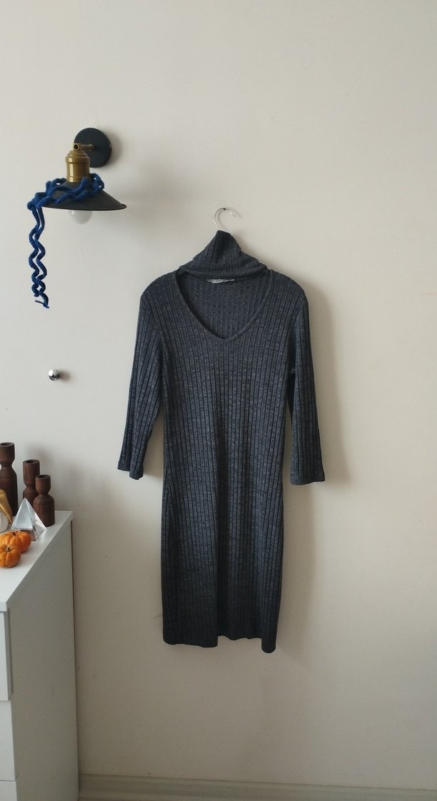 Gri renkte, uzun kollu ve yüksek yakalı triko elbise. Vücuda oturan kesimi ve sade deseniyle şık günlük kullanıma uygundur. boy 94 cm koltuk altından iki kol arası 44 cm yumuşak dokuda örme elbise