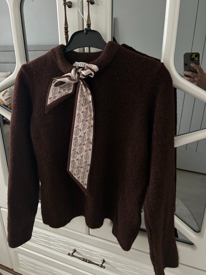 Kahverengi örgü kazak, halter yaka ve uzun kolludur. Salaş kesimi ve midi boyu ile vintage tarzda, boyun kısmında desenli fular bulunur. Hiç giyilmedi