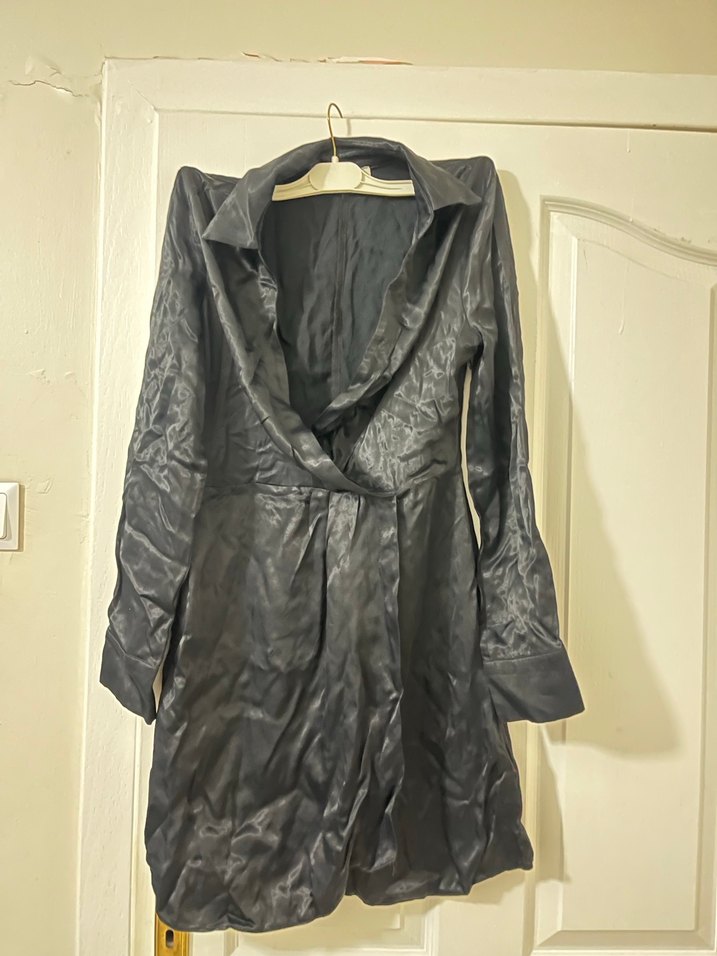 Uzun siyah saten kumaştan, drapeli ve oturan kesime sahip bu kadın ceketi, notched yaka ve uzun kolludur. Gotik tarzda, ofis için uygun şık bir parçadır. Ürün kamerada belli etmedi kendini. S ve m bedene uygun