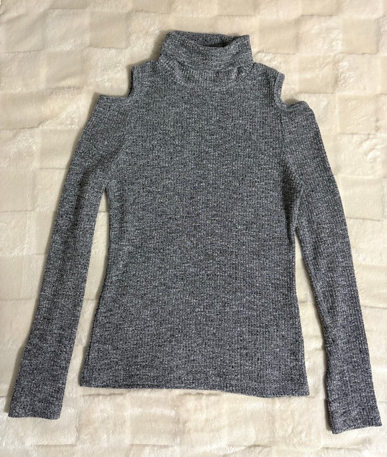 Gri renkli, yüksek yakalı ve uzun kollu, omuzları açık triko kazak, günlük kullanım için rahat ve şık bir tercih.