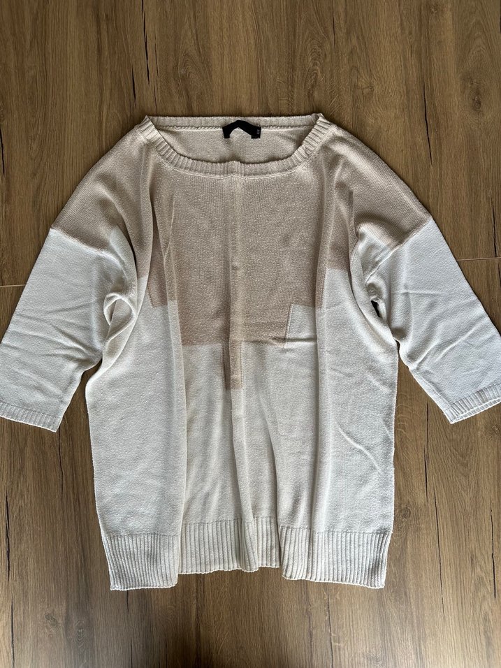 Yuvarlak yaka, yarım kollu ve salaş kesime sahip triko. Yumuşak dokulu ve rahat. Hafif bir tüylenme var görsellerde mevcuttur