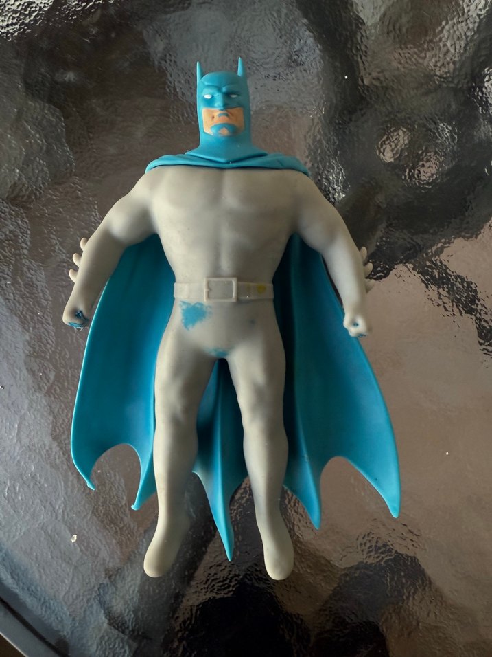 #Batman figürü Gri renkte Batman aksiyon figürü, canlı mavi pelerin ve maskesiyle klasik süper kahraman görünümünü yansıtıyor.