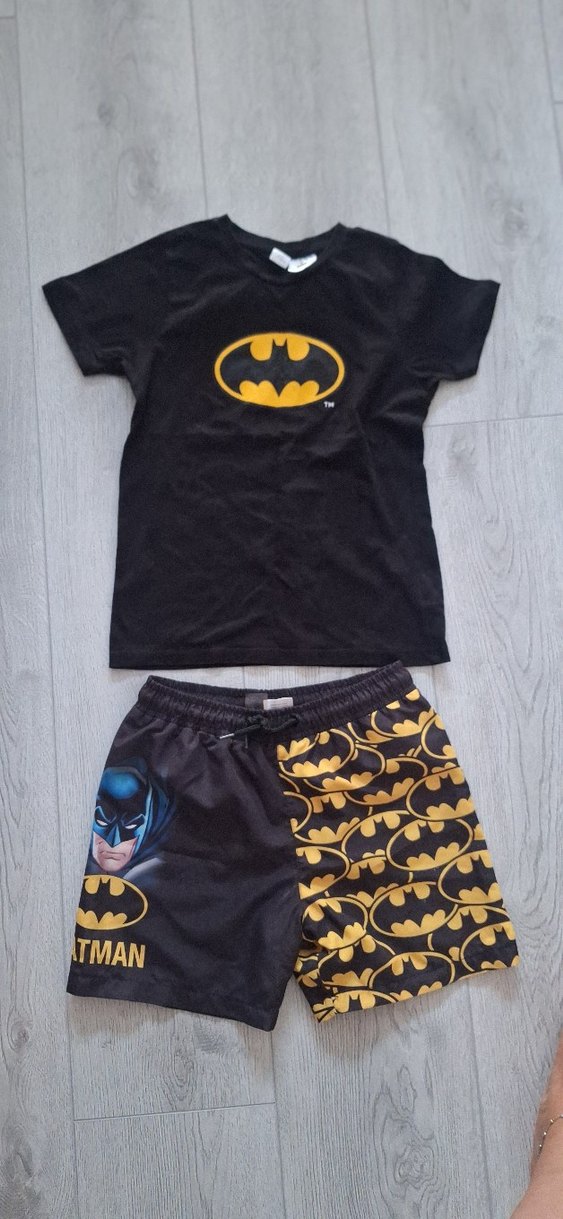 Kısa kollu siyah üstte Batman logosu, yanlarda Batman baskılı şort ile erkek çocuk mayo takımı.