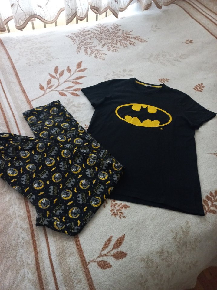 Siyah, kısa kollu, bisiklet yaka, fitted kesim üst ve baskılı midi boy pantolonlu Batman temalı erkek pijama takımı. Rahat ve şık bir görünüm sunar.