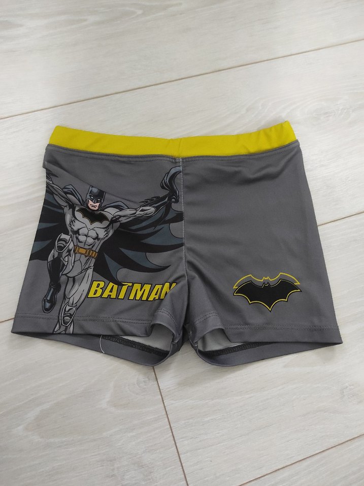 Sarı bel bantlı, Batman baskılı gri erkek çocuk mayo şortu. Kısa paça ve rahat kesimle tasarlanmıştır. 5 6 yas ıcın ıdeal