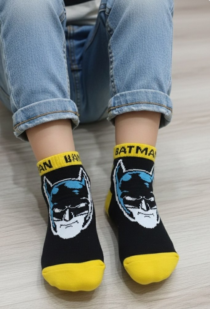 Renkli Batman baskılı erkek çorabı, sarı burun ve manşet detaylarıyla. Manşette "BATMAN" yazısı bulunur.