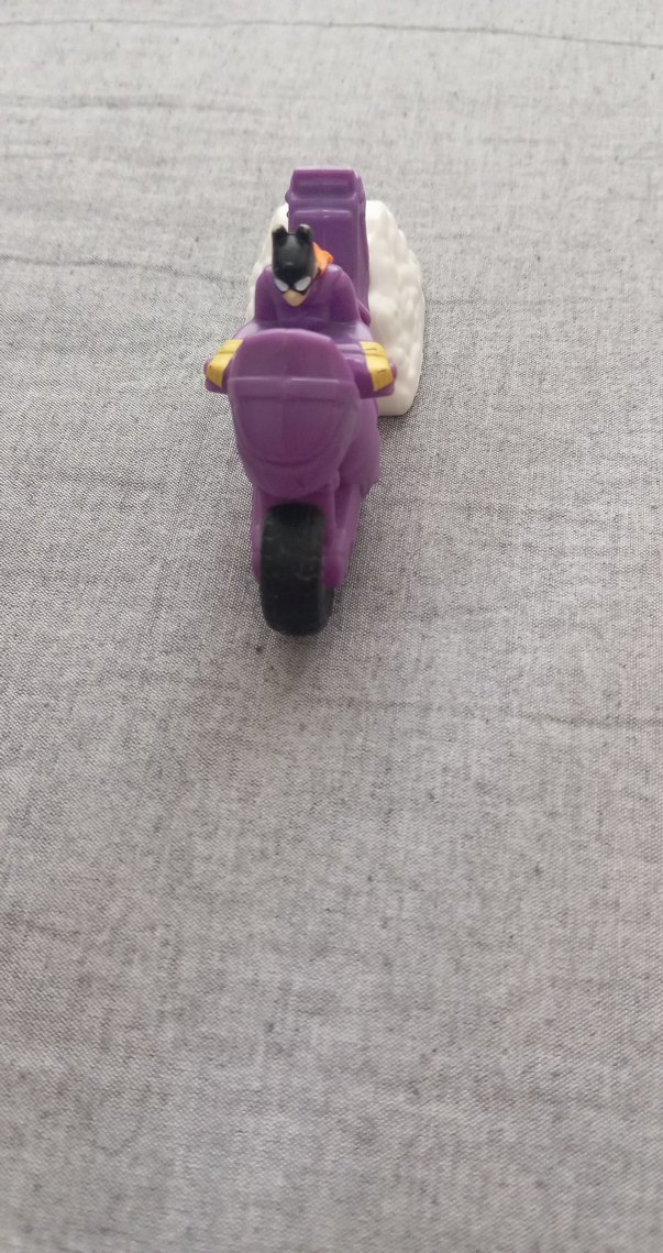 Canlı detaylara sahip, mor renkli motosiklet süren aksiyon figürü. ️