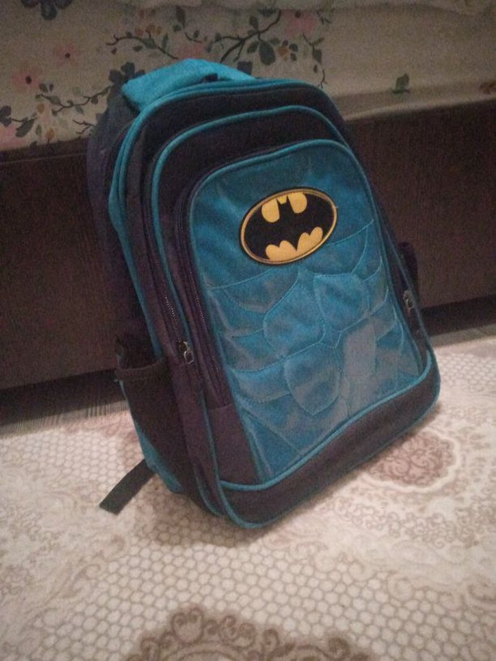 Koyu mavi renkte, ön cephesinde Batman logosu bulunan çok bölmeli çocuk okul çantası.