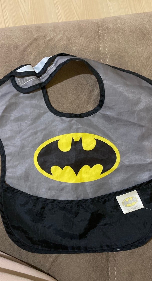 Önde baskılı Batman logosu bulunan koyu gri bebek önlüğü. Boyun kısmında pratik kapanış ve döküntüleri tutan alt cep mevcuttur.