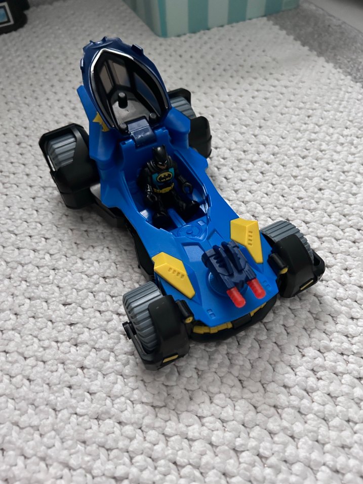 Küçük figürlü kokpitli koyu mavi oyuncak araba, sarı detaylar ve gri tekerleklerle tasarlanmıştır.