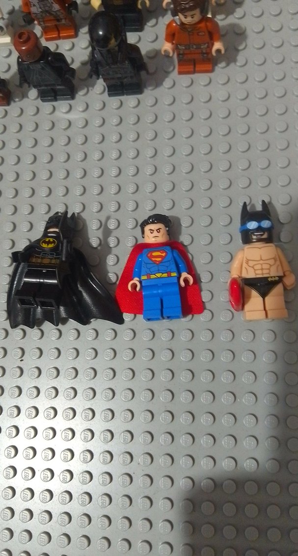 Siyah kostümlü Batman, kırmızı pelerinli Superman ve mavi gözlüklü farklı Batman figürleri gri taban üzerinde yer alıyor. ♂️