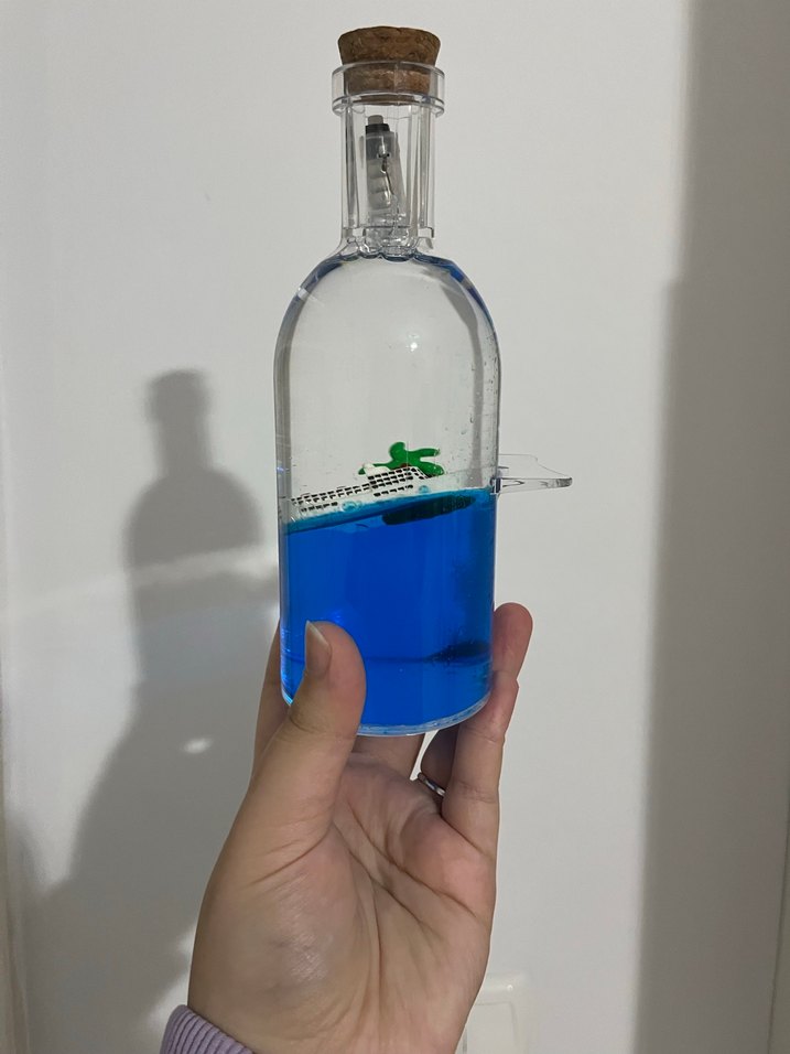 Mavi sıvı dolu şeffaf şişe içinde renkli gemi şeklinde su oyuncağı bulunur. Şişe mantar kapaklıdır. Renkli ışıklar mevcuttur ayaklı şık bir dekorasyon ürünü