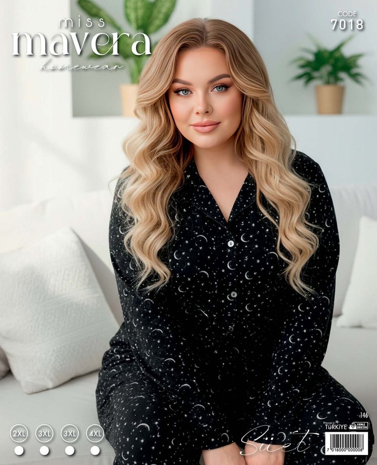 Battal Beden Siyah Desenli Uzun Kollu Kadın Pijama Takımı