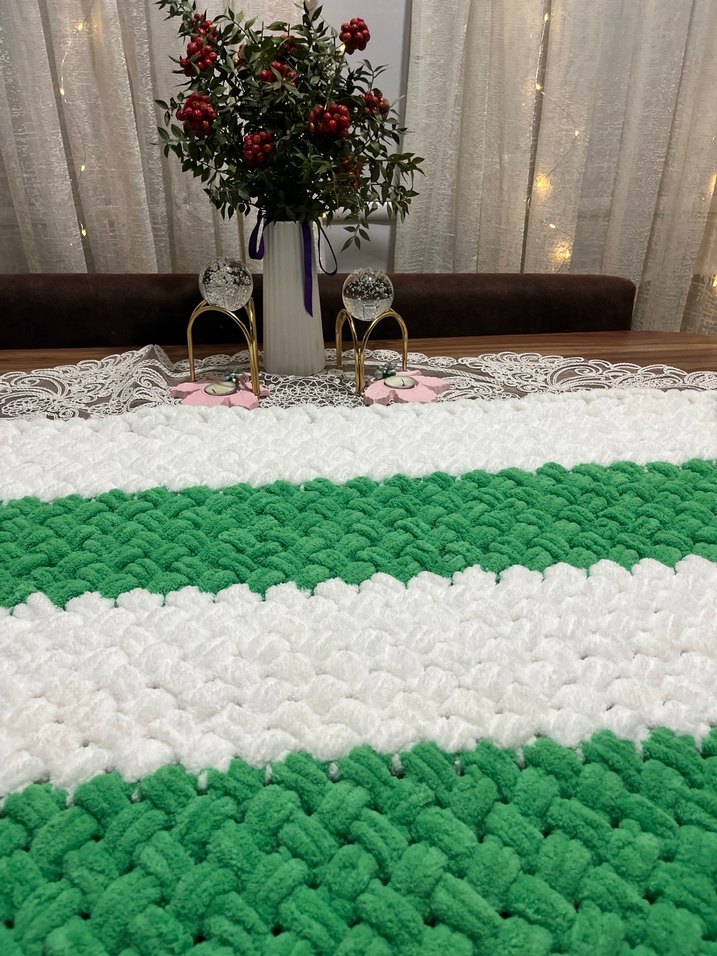 Yeşil ve beyaz çizgili, yumuşak dokulu örgü alanınıza sıcaklık katar. ️