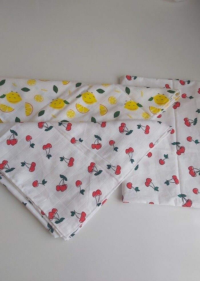 2 adet 80×75 müslin battaniye, 1 adet 35×45 pamuklu kumaştan yastık kılıfı