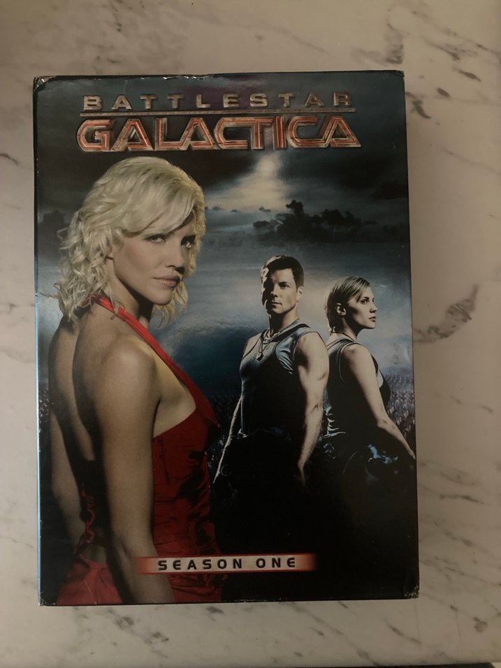 Battlestar Galactica Sezon 1 DVD kutusu, kapakta ana karakterler yer almakta. Bilim kurgu dizisi koleksiyonu.