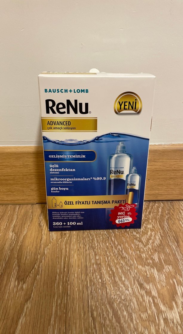 Bausch+Lomb ReNu Advanced çok amaçlı solüsyon, gelişmiş temizlik ve üçlü dezenfektan sağlar, mikroorganizmaların %99,9'unu yok eder. 360 ml ve 100 ml şişe içerir.