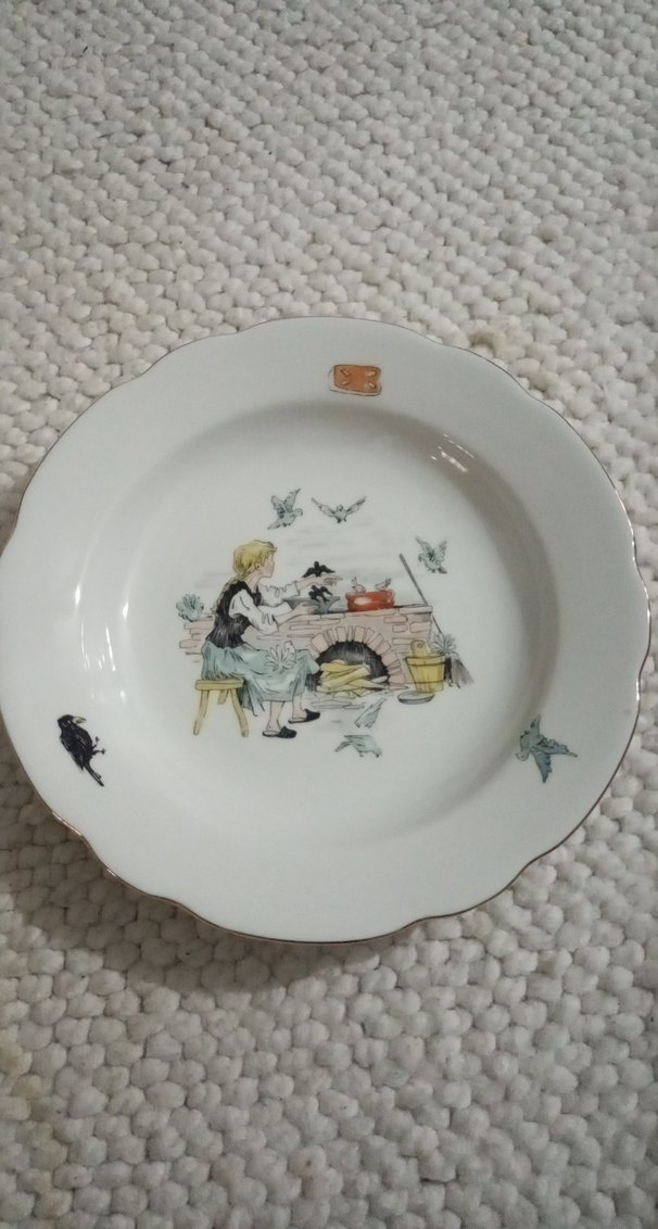 Pastel renkli, beyaz dekoratif tabak. Kenarı dalgalı ve altın detaylı, soba başında kız ve kuş figürlü. ️