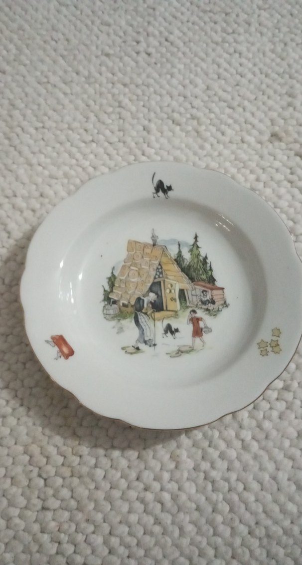 Pastel renklerde ev, insanlar ve hayvanlar desenli beyaz çocuk tabağı, klasik tasarımlı. ️