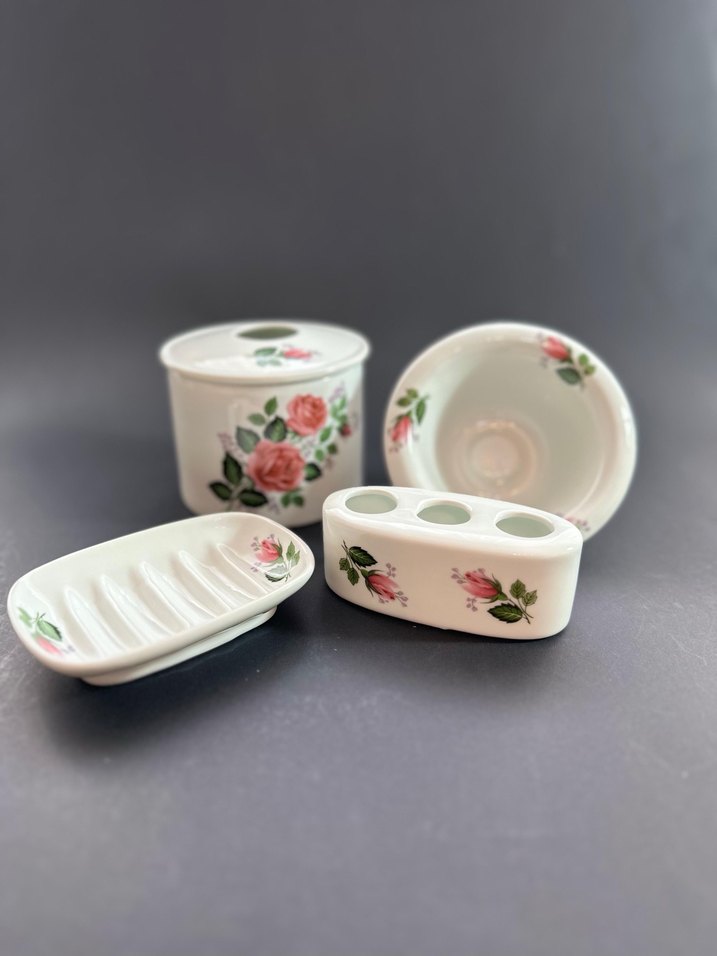 Banyo veya Kişisel Bakım Seti. 1950-1970 yılları arasında bu tür setler banyolara zarafet katmak için çok popülerdi. İşte setin içindeki parçaların kullanım amaçları: Sabunluk (Sol öndeki çizgili parça): Üzerindeki kabartmalı çizgiler, katı sabunun suyun içinde kalıp yumuşamasını engellemek için tasarlanmıştır. Islak sabunun hava almasını sağlar. Diş Fırçalık (Sağ öndeki üç delikli parça): Üstteki üç delik, diş fırçalarını dik bir şekilde birbirinden ayrı tutmak içindir. Hijyenik bir kullanım sağlar. Pamukluk / Saklama Kabı (Arkada kapaklı duran silindir parça): Kapağının ortasındaki delik, içinden kolayca pamuk çekebilmenizi sağlar. Genellikle makyaj temizleme pamukları veya rulo pamuk koymak için kullanılır. Aksesuar veya Su Kasesi (Sağ arkadaki yuvarlak parça): Bu parça iki amaçla kullanılabilir; ya takılarınızı (yüzük, küpe gibi) banyoda çıkarmak için bir kap olarak ya da ağız çalkalama suyu için bir kase olarak tasarlanmıştır.