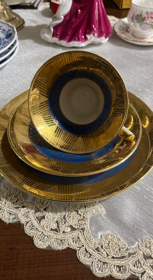 Koyu altın renkli, desenli fincan, tabak ve çay tabağı seti, şık masa düzenleri için uygundur. ☕