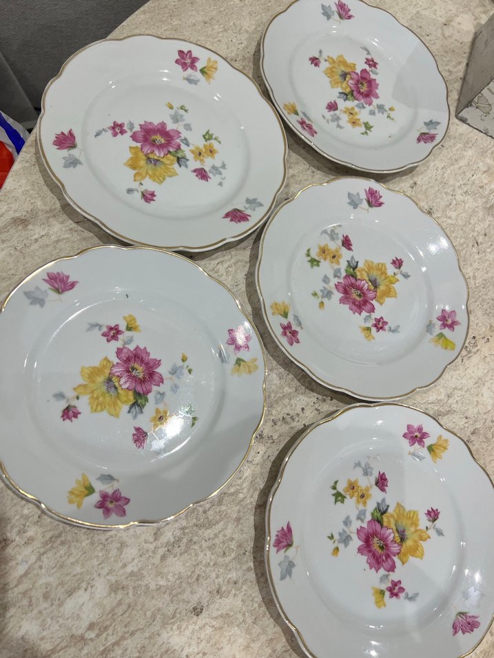 Baveri a antika Pastel çiçek desenleri ve altın detaylı kenarlarıyla beyaz porselen tabak seti. Zarif ve şık tasarım sunar. ️5 adet birinde minik bir atık var görselde