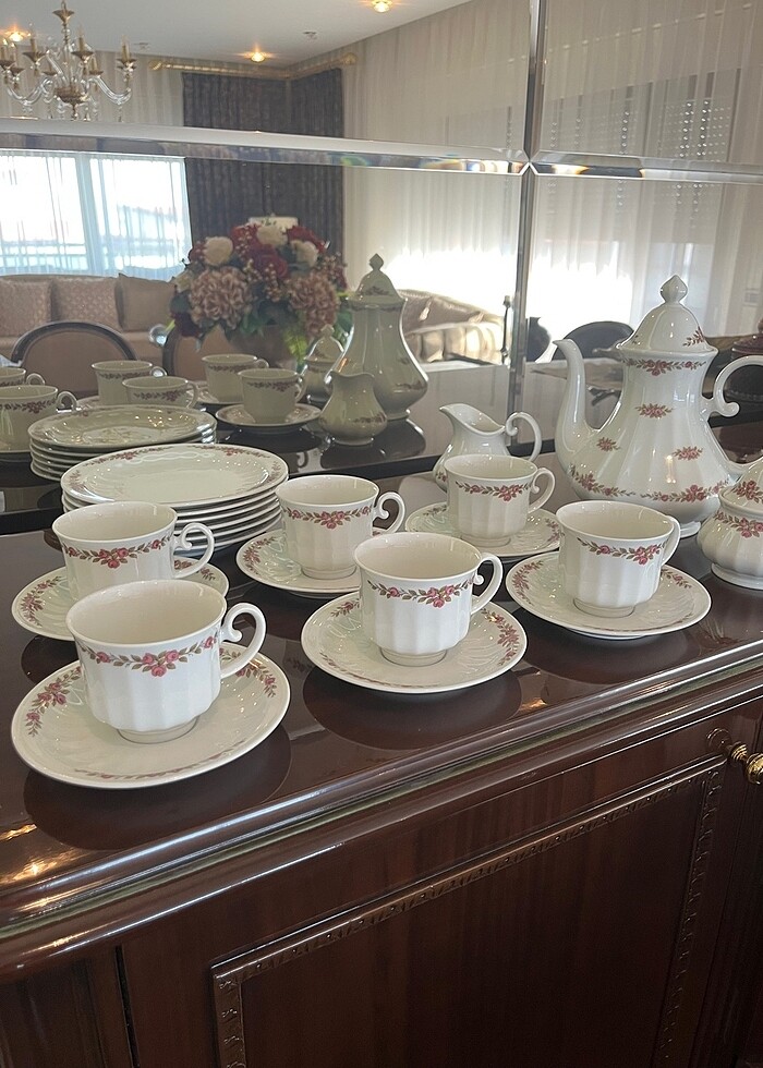 Zamanında Almanyadan alınmış 50 yıllık Çay takımıdır. 6 adet Çay fincanı, 6 adet Pasta tabağı (19 cm) Demlik ,Sütlük, ve şekerliği mevcuttur. Demlik 24 cm boyunda. Hiç bir hatası kusuru yoktur.