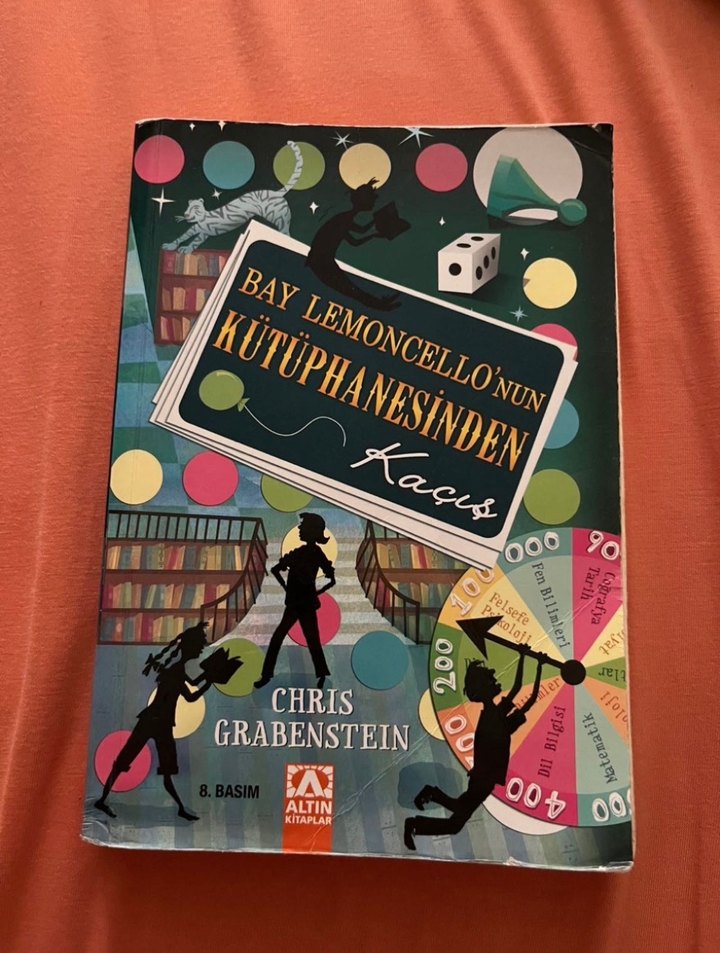 Chris Grabenstein'in yazdığı, oyun temalı renkli kapaklı 'Bay Lemoncello'nun Kütüphanesinden Kaçış' romanı.