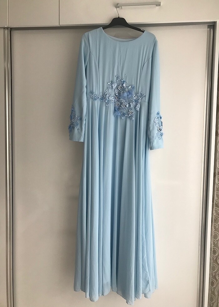Şifon kumaşa sahip belinde ve kollarında güpür ve taşlı süslemeleri bulunmakta A kesim iyi durumda 40 bedene uyumlu, ayrıca kendi kumaşıyla aynı renkte şalı var o da yanında hediye verilecektir.