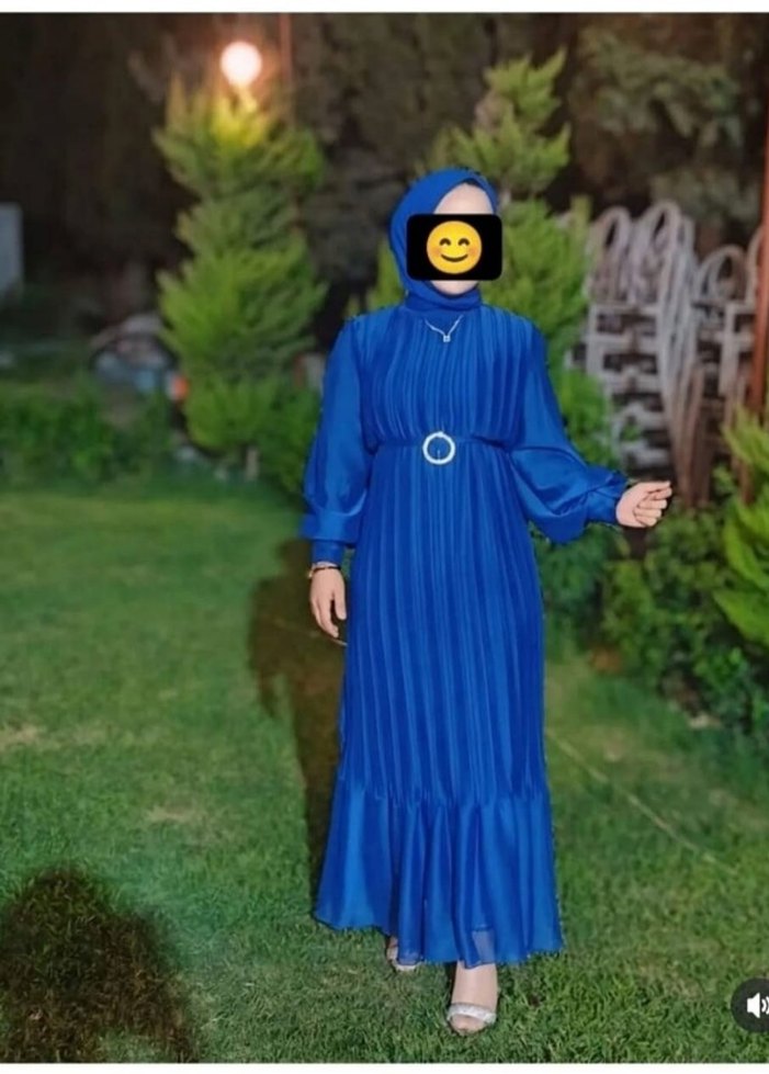 Bu uzun, bol kesim elbise piliseli tasarımı, yüksek yakası ve uzun kollarıyla dikkat çekiyor. Sentetik kumaştan üretilmiş, koyu mavi tie-dye deseniyle gotik ve bohem tarzları birleştiriyor. Günlük mütevazı kullanım için uygun.