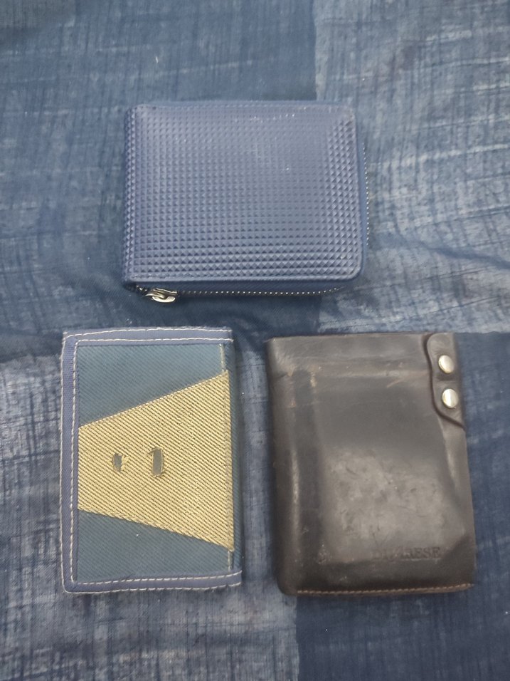 cüzdan seti, koyu lacivert ve siyah renkte. Düz, desensiz tasarıma sahip, sokak stili etkileri taşıyor. Kullanım izleri ve karşı kültür havası var. en son resimde kırmızı kalemle çizilmiş erkek cüzdanlarindaki nokna kusur yeri gösterdin üstteki bayan alttakiler erkek cüzdanı toplam 3 parçaya gönderilecektir