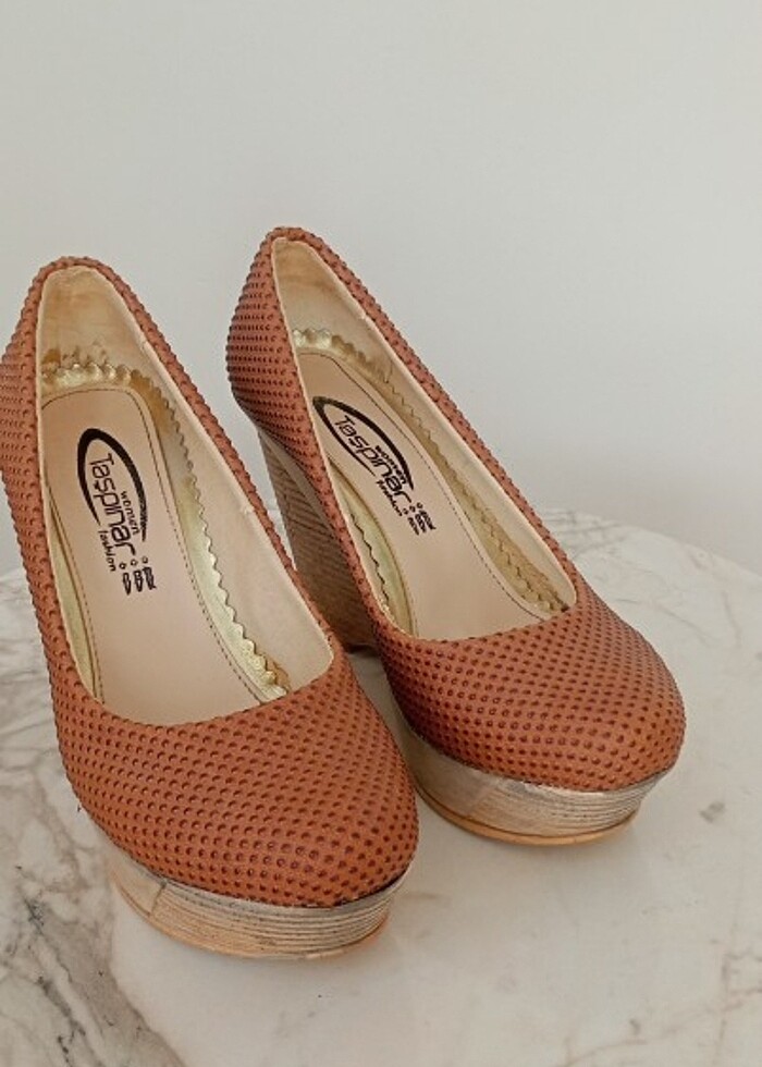 Çok şık yenidir. Hiç kullanılmamış.kahverengi tahta dolgu topuklu.