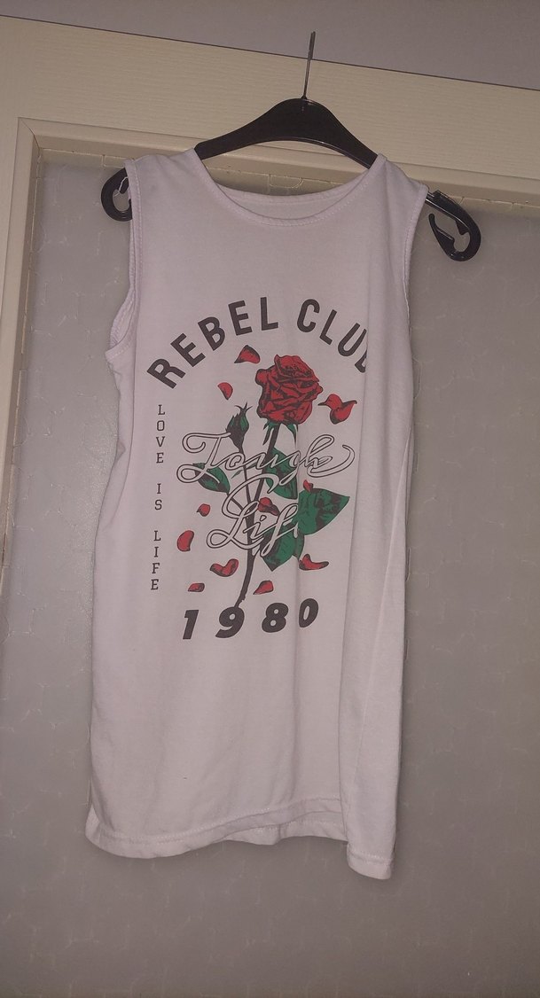 Pamuk kumaştan, kolsuz ve bol kesim bayan tişörtü. Beyaz renkte, baskılı gül ve 'REBEL CLUB 1980' yazılı, fırfır detaylıdır.