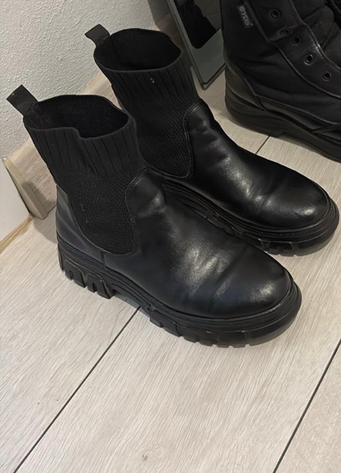 Bu siyah kauçuk botlar, platform topuk ve desen içermeyen düz tasarımıyla gotik ve sokak stilini günlük kullanım için birleştiriyor.