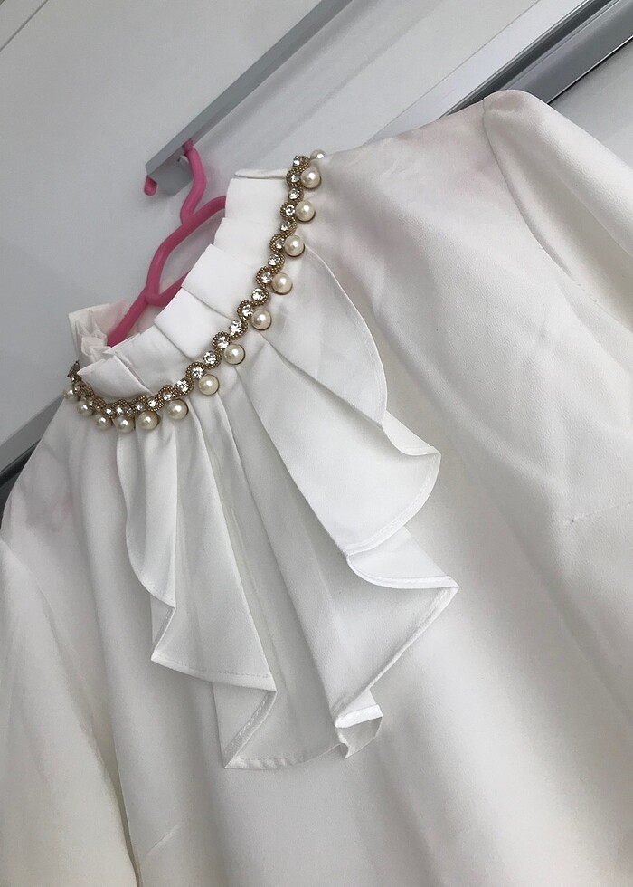 Hiç giyilmedi. 44 beden ama 42 de olur kalıbı biraz dar. Kırık beyaz yakası fırfırlı taşlı incili süslemeli