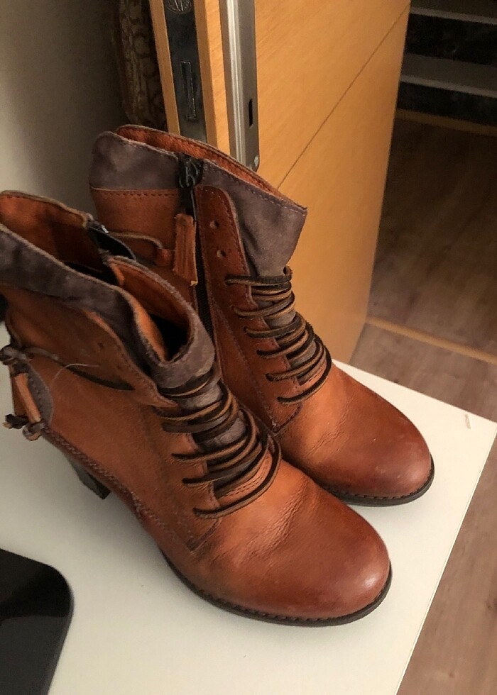 Deri taba rengi, yandan fermuarlı kalın topuklu bayan botu. Az kullanılmış temiz bir üründür