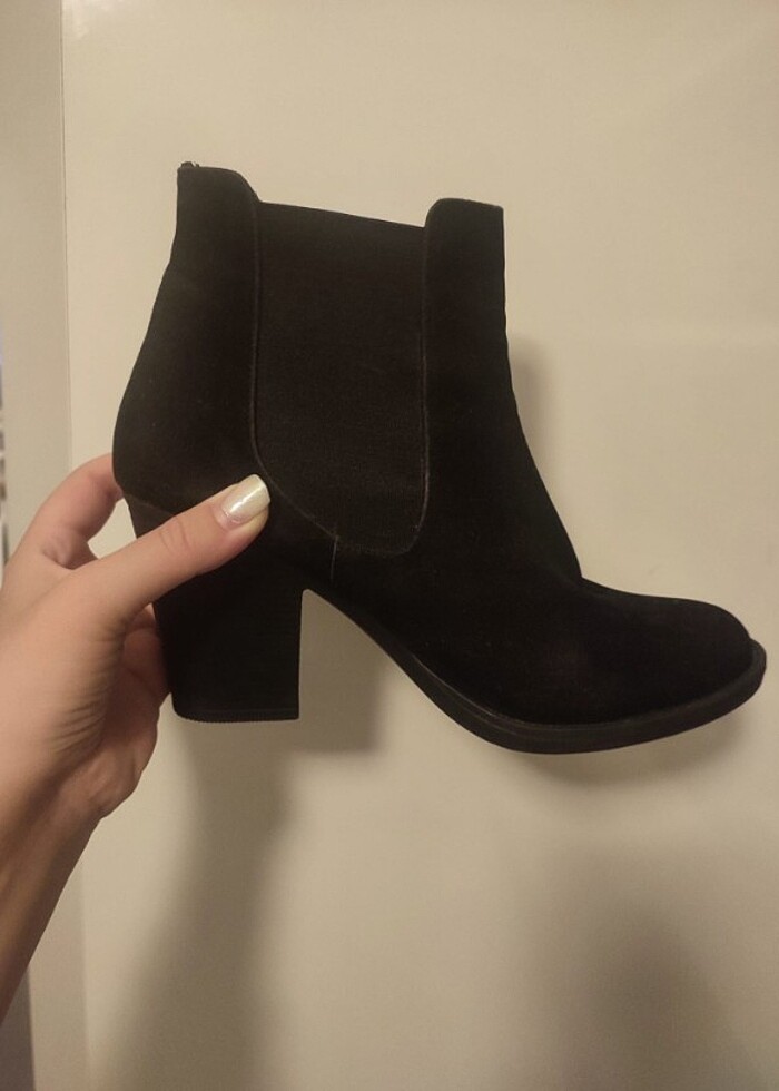 süet topuklu bot. trendyol.dan aldım. topuk iç kısmında çok az soyulma mevcut. Başka sorunu yok. çok şık ve rahat. aynı tarz botum fazla olduğu için satışta